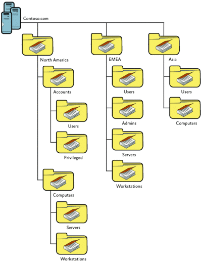 OUs: OU là một container được dùng để tổ chức các đối tượng trong một domain thành các nhóm quản trị luận lí (logical). OUs cung cấp phương tiện thực hiện các tác vụ quản trị trong hệ thống như là quản trị user và resources, đó là những scope đối tượng nhỏ nhất mà bạn có thể ủy quyền xác thực quản trị. OUs bao gồm nhiều đối tượng khác như là user accounts, groups, computers và các OUs khác tạo nên các cây OUs trong cùng một domain. Các cây OUs trong một domain độc lập với kiến trúc các cây OUs thuộc các domain khác.