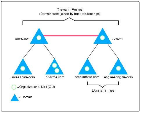 Domain: Cốt lõi của kiến trúc này chính là Domain, nơi lưu trữ hàng triệu đối tượng. Tất cả các đội tượng trong hệ thống mạng của một domain thì do chính domain đó lưu trữ thông tin các đối tượng. AD được kiến tạo bởi một hay nhiều domain và một domain có thể triển khai trên nhiều physical structure. Việc access vào domain được quản trị thông qua Access Control Lists (ACLs), quyền truy xuất trên domain tương ứng với từng đối tượng.